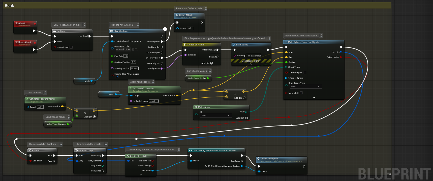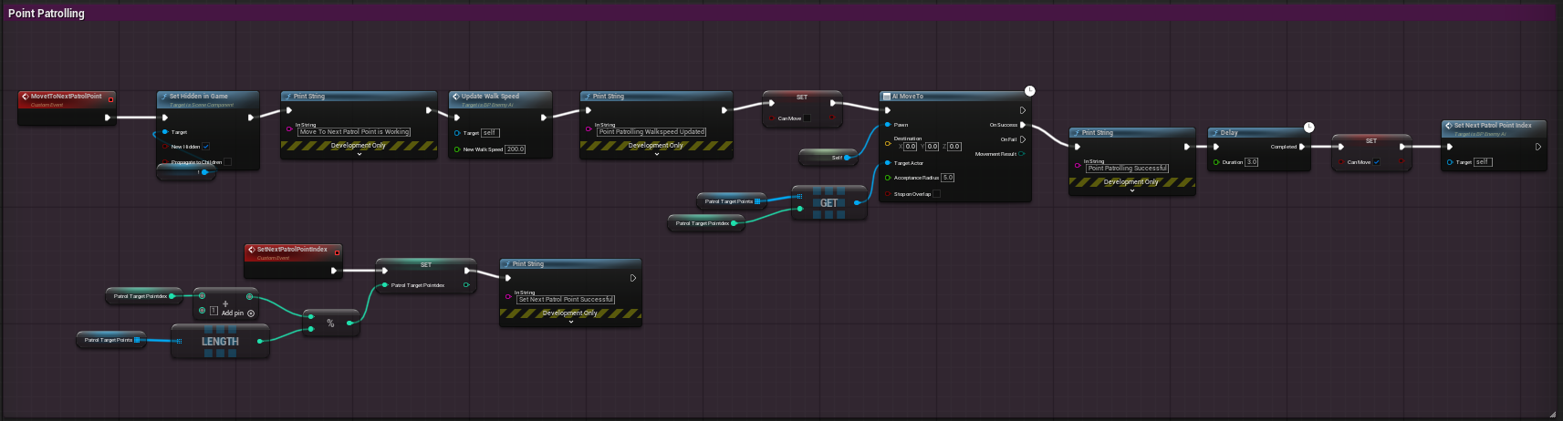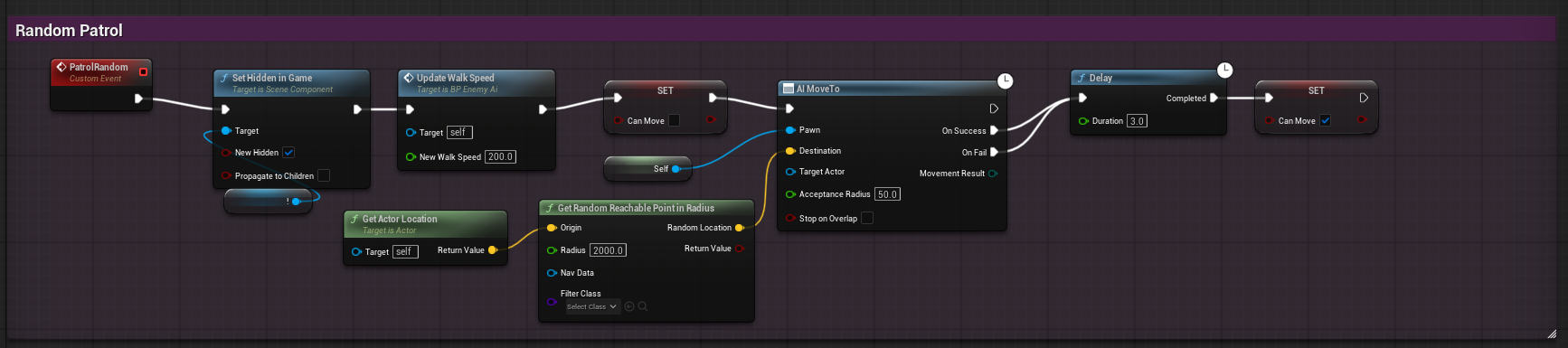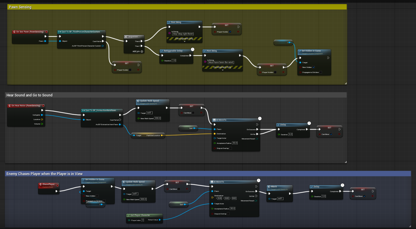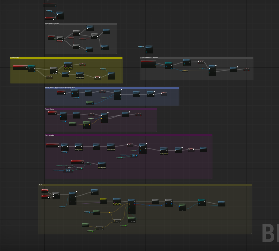 This is the total coding map for the Enemy AI. The most important pieces of coding in this guy are the Pawn Sensing, Patrolling, and Bonk.