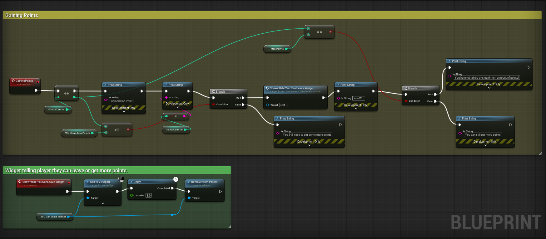This code keeps track of the points. It also has the number of points you need to win the game, and the maximum amount of points you can get in total. In this code, there is also a widget that will pop up on screen to tell the player they have the correct win point, so they can leave the game, or they can continue to get the maximum amount of points. In the future, I will implement an extra incentive to encourage people to continue to earn the maximum amount of points.