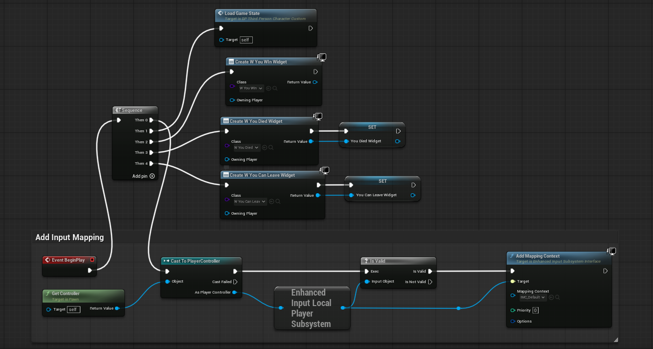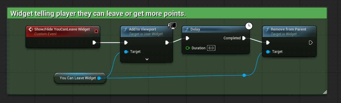 First, we have all the different widgets that we use throughout the game. Currently, there are three in use. These are the YouWin Widget, the YouDied Widget, and the YouCanLeave Widget.