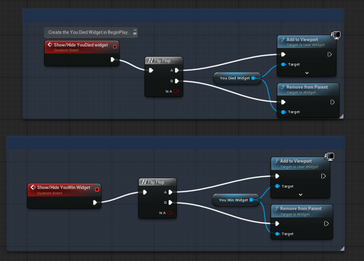 The first two are pretty self-explanatory. They happen when you win the game and when you lose the game. I got the coding for these widgets from the teacher, but for some reason, they do not show when they are called. This is something that multiple people have tried to help me with, so I will have to further discuss with my teacher about why they are not working.