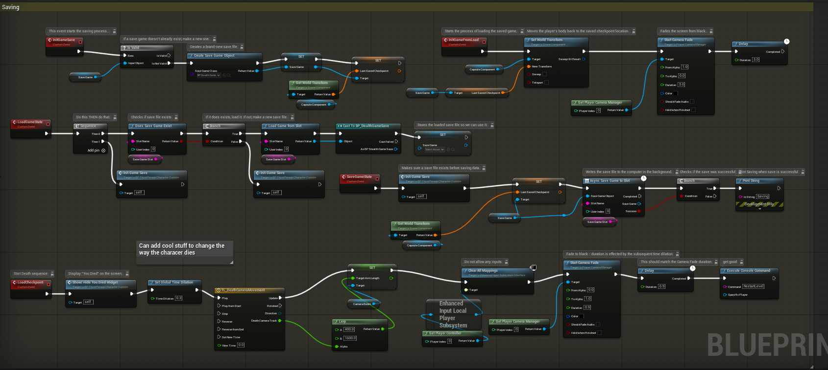 Finally, we have the savings system. This is meant to be used as a checkpoint system. We added it to our game a couple of weeks ago, and at first, it did work for me. However, it seems that something has happened to my checkpoint blueprint that causes my Unreal Engine file save to corrupt while in the engine. So I currently do not have it in use in my game.
